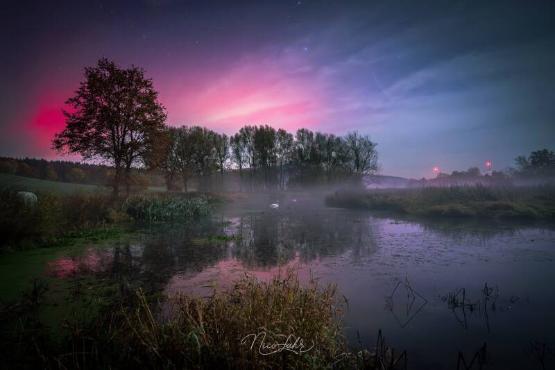 Zunächst unten nur Nebel auf den Wiesen, fing es an am Himmel rot zu leuchten. Gerade so vom Nebel, dass es richtig ästhetisch für das Bild ist, aber dennoch der Himmel frei zu sehen war. Vielerorts saß komplett im Nebel, da will ich doch nicht meckern. An der Schwalm ist erstmal jede Art von Getier weggeflogen als ich kam, aber zwei Schwäne chillten weiter im Wasser und ließen sich mehrere Momente fotografieren, teilweise sogar mit Langzeitbelichtung ohne Verwackelung. Dazu auch noch eine schöne Leonide eingefangen (auf einen anderen Bild)