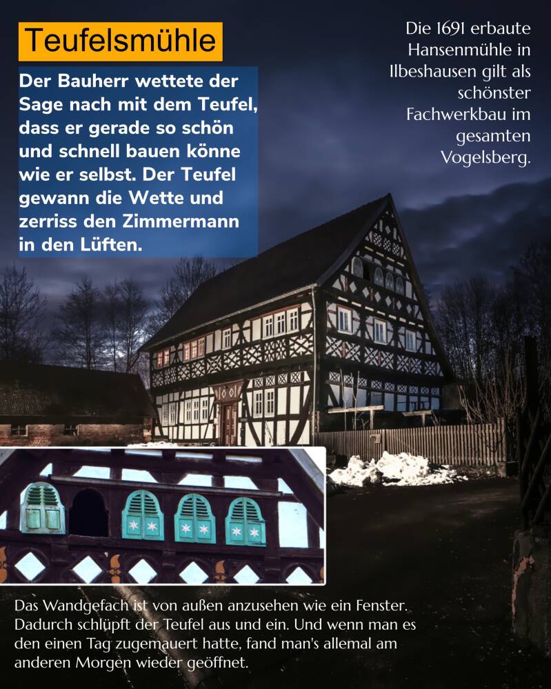 Vorgangerbaus errichtete Hansenmühle in Ilbeshausen. Neben dem Crainfelder Edelhof gilt sie als der schönste ländliche Fachwerkbau in Oberhessen und war als ein Lehen der Familie Riedesel jahrhundertelang im Besitz der alteingesessenen Müllerfamilie Usinger. Wie sie zu ihrem Namen „Teufelsmuhle" kam, erzählt