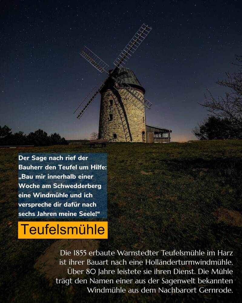 Vor langer Zeit lebte in Gernrode ein Müller mit Namen Weigel. Der war mit seinem Leben nicht zufrieden und wollte hoch hinaus. Nachts um zwölf rief Müller Weigel den Teufel an, um ihm ein Geschäft vorzuschlagen: Bau mir innerhalb einer Woche am Schwedderberg eine Windmühle und ich verspreche dir dafür nach sechs Jahren meine Seele!