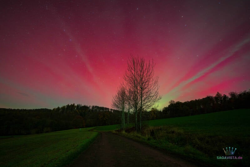 Helles Polarlicht bis weit in den Süden Europas war in der Nacht vom 10. - 11. Mai 2024 sichtbar. Es handelte sich um den stärksten Sonnensturm seit über 20 Jahren. Alle 11 Jahre etwa haben wir einen neuen Sonnenzyklus. Das ist die Zeit, in der die Sonne von einem Minimum an Aktivität zum nächsten Minimum an Aktivität geht. Wir befinden uns im 25. Zyklus und erreichten im Jahr 2024 das Maximum. Deshalb waren mehrmals Sonnenlichter auch in Hessen zu sehen. Polarlichter entstehen, wenn elektrisch geladene Teilchen von der Sonne auf das Magnetfeld der Erde treffen. Das Bild zeigt Asterode in den frühen Morgenstunden in jener Nacht mit einem der größten Beamer, Blick nach Norden.