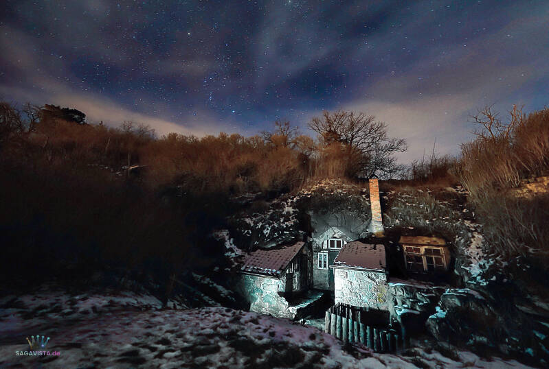 Haus von Karl Rindert in einer klaren Winternacht, das Haus befindet sich auf dem Hang, am Weg zur Altenburg.