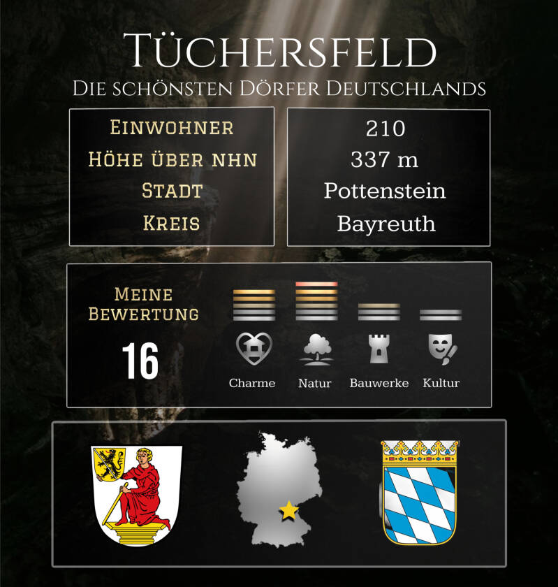 Märchenhafte Fachwerkhäuser vor riesigen Felsen: Natur und Gebäude gehen in Tüchersfeld in der fränkischen Schweiz Hand in Hand. Das Szenario des kleines Dorfes ist so imposant, dass es weit über die Region hinaus bekannt ist.