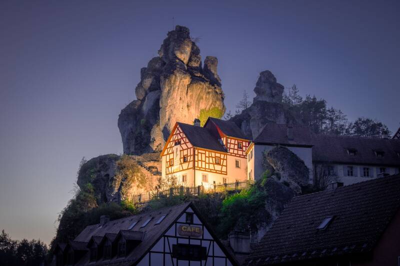 Der Sage nach soll die Gesteine einst ein Riese aus der nahegelegenen Burg Pottenstein ins Tal geworfen haben. In Wirklichkeit sind die steilen, fast senkrecht in den Himmel ragenden Felsklötze, Reste eines in der Jurazeit enstandenen Riffes, das in Jahrmillionen vom nahegelegenen Fluss Püttlach so zugeschliffen wurde. An dessen Hängen haben die Einwohner ihre Fachwerkhäuser gebaut. Das Bild zeigt das Fränkische Schweiz Museum, das über die Region informiert. Empfehlenswert ist auch ein Abstecher in die nahe Region: Die lohnenswerte Teufelshöhle kann man im Rahmen einer Führung besichtigen. Wanderfreunde kommen auf der beliebten Route vom Parkplatz Zeckenstein durch den Wald hoch zur Aussichtsplattform Fahnenstein auf ihre Kosten.