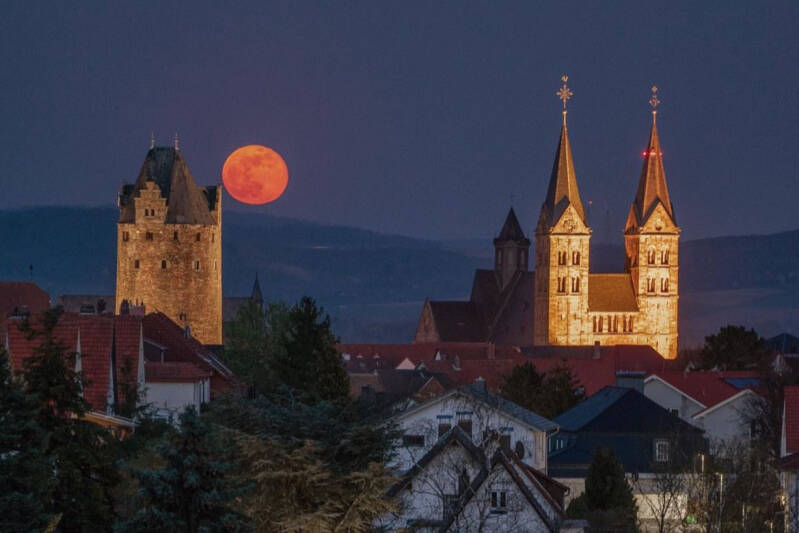 Blutmondaufgang über Fritzlar. Bild aus dem Kalender "Mystische Heimat: Schwalm-Eder" Jetzt bestellen.