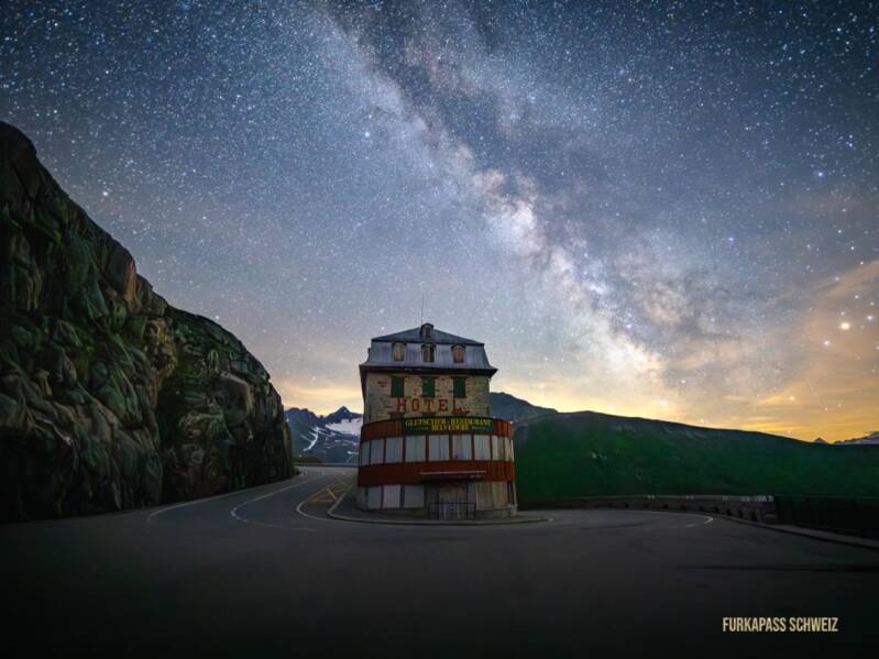 Durch die dichte Besiedlung Europas wird in der modernen Gesellschaft viel künstliches Licht erzeugt. Es gibt aber Regionen, in denen man in einen fast natürlichen dunklen Sternenhimmel schauen kann. Diese werden zum Teil besonders geschützt. Dabei geht es auch um den Schutz nachtaktiver Tiere und Energieeinsparung durch sinnvoll eingesetzte Beleuchtung. In den Bergen gibt es eine sehr geringe Lichtverschmutzung und wenig Smog, weil es kaum große Städte gibt. Durch den höheren Blickwinkel sieht man zudem das Zentrum der Milchstraße besser. Das Bild zeigt das verlassene Hotel auf dem Furka Pass der Schweiz auf ca. 2300m Höhe.