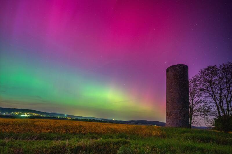 Spießturm, das Wahrzeichen der Gemeinde Frielendorf, unter dem Polarlicht vom 11.Mai 2024