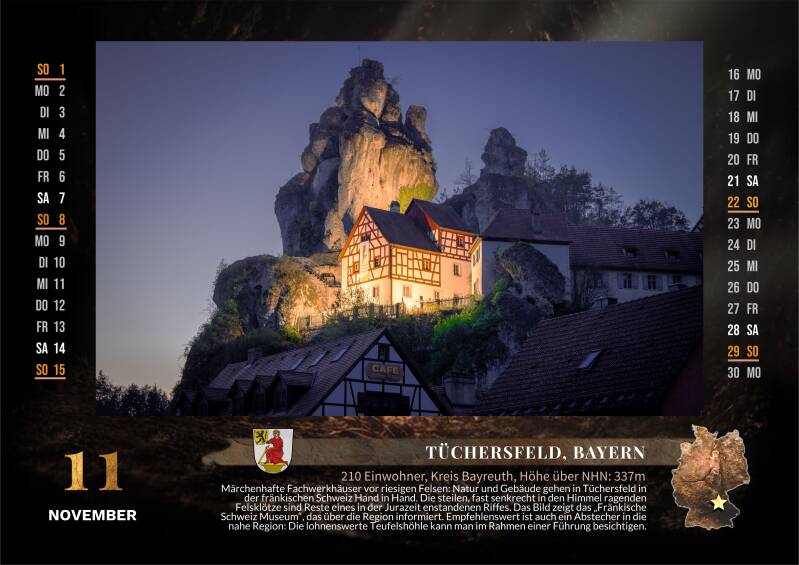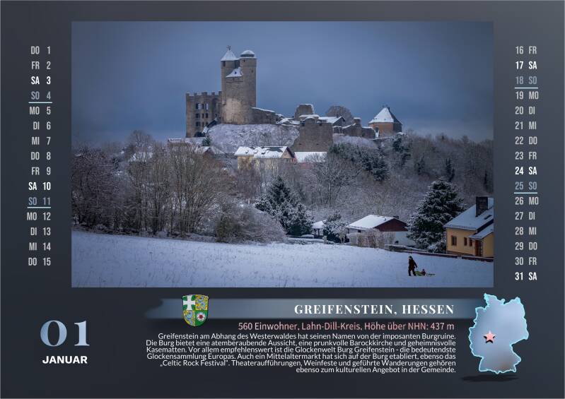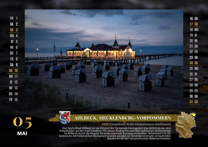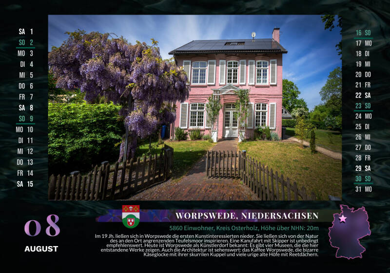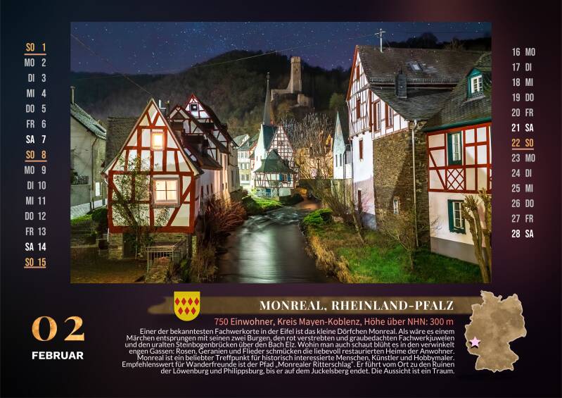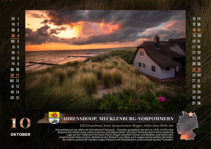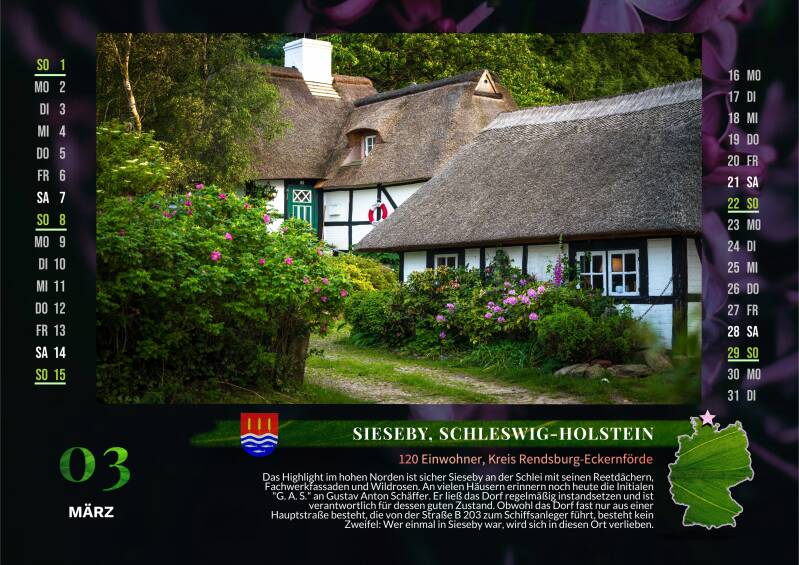 Unsere Dörfer sind oft verborgene und unterschätzte Schönheiten. Friedliche Szenen und eine idyllische Atmosphäre prägen diese Perlen, statt verstopfte Großstadtautobahnen und Massentourismus. "Deutschlands schönste Dörfer" ist eine Hommage an das traditionelle Landleben und Deutschlands Dorfkultur. Der Kalender zeigt 12 außergewöhnliche Fotografien aus den schönsten Dörfern Deutschlands inkl. spannender Infos und Ausflugtipps für Ihre nächste Reise.