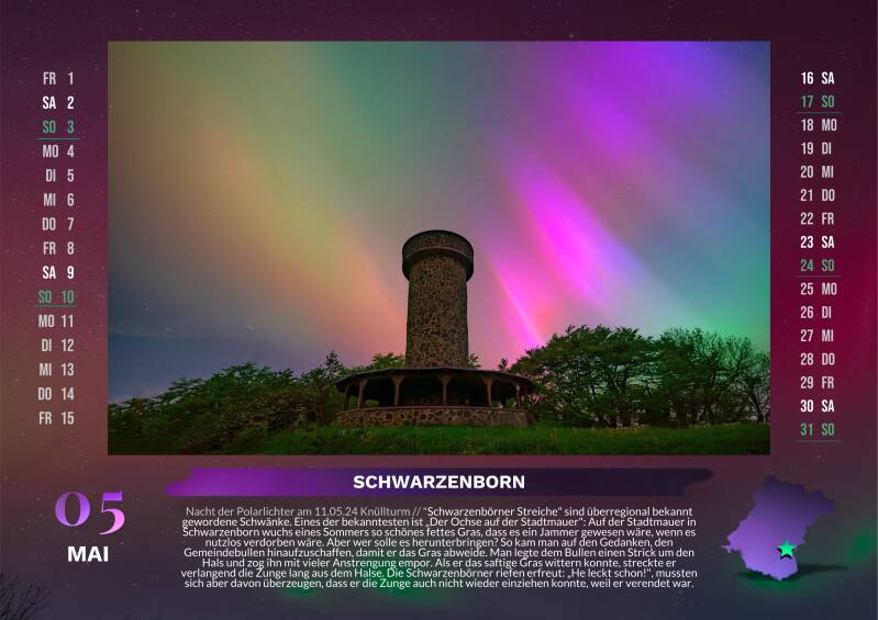 Er präsentiert Ihnen 12 schöne oder geheimnisvolle Orte der Region. Mit einzigartigen Wetterfotografien und faszinierenden Geschichten über Mythen, Sagen und Legenden lädt dieser Kalender Sie ein, die verborgenen Schätze des Schwalm-Eder-Kreises zu entdecken. Die alten Geschichten wurden aufwendig gesammelt aus historischen Bänden, viele davon findet man nirgends im Internet. Tauchen Sie ein in die Welt der Mystik und Magie und lassen Sie sich von der Schönheit und dem Charme dieser Region verzaubern.