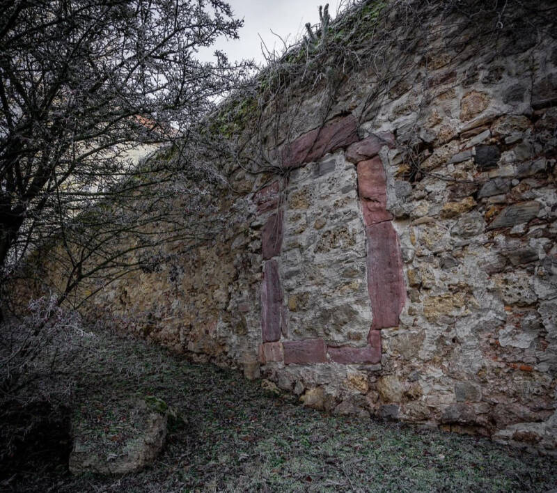 Aussenmauer mit der zugemauerten Eingangstür ist